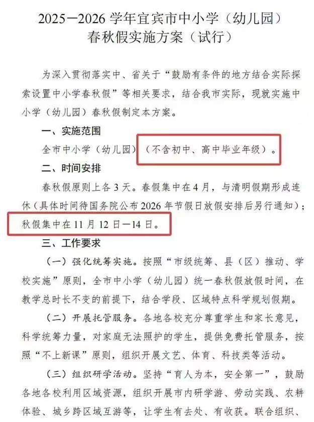 10月21日,红星新闻记者从宜宾市教育体育局获悉,从2025年秋期开始,四川宜宾将在全市中小学(幼儿园)(不含初中、高中毕业年级)进行春秋假试点,原则上春假与秋假各3天,合计6天假期。