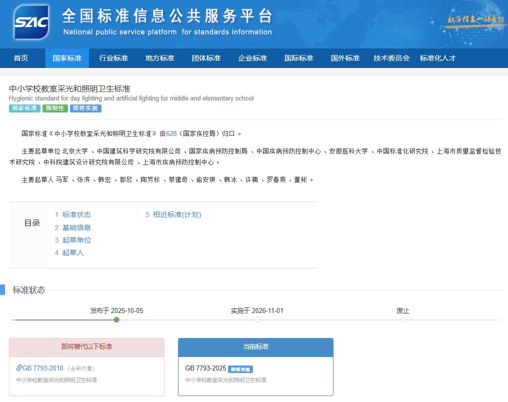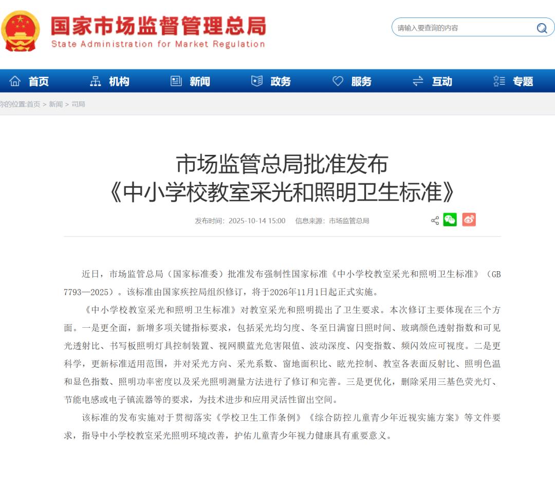 深圳新闻网2025年10月21日讯(记者 王茜)日前,国家市场监督管理总局(国家标准委)批准发布强制性国家标准《中小学校教室采光和照明卫生标准》,该标准由国家疾控局组织修订,将于2026年11月1日起正式实施。