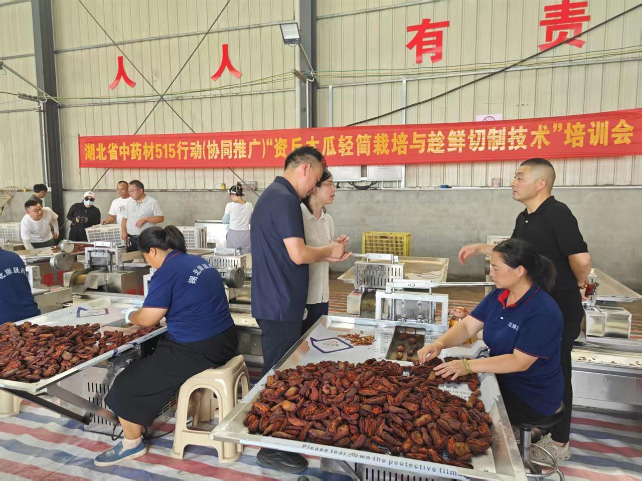 针对资丘木瓜产业长期存在的种植粗放、加工低效等痛点,党支部书记葛月宾教授团队在湖北省中药材“515”行动(协同推广)的支持下,创新推出三大技术体系:一是总结长期种植经验,示范推广“轻简栽培技术”。2025年2月,在长阳榔坪镇马坪村海拔900米的标准化基地,118户种植大户和20余家合作社系统学习“一分育苗、二分修剪、三分施肥、四分防害”标准化流程,该技术使亩产提升30%,破解了传统种植的效益瓶颈。二是针对老化果园改造,推广“三整三改”技术。2024年测产数据显示,示范区亩产达7441斤,较传统种植增产43.2%,每亩增收2200元。三是抓住产地加工机遇,研制应用“趁鲜切制”技术,省去传统木瓜加工中耗时费力的水润、干燥步骤,不仅降低能耗30%,更能减少有效成分损耗与霉变风险,使产品附加值提升20%以上。湖北康晟药业有限公司等应用该技术后,显著提升木瓜片品质,产品价格实现翻番,效益十分可观。
