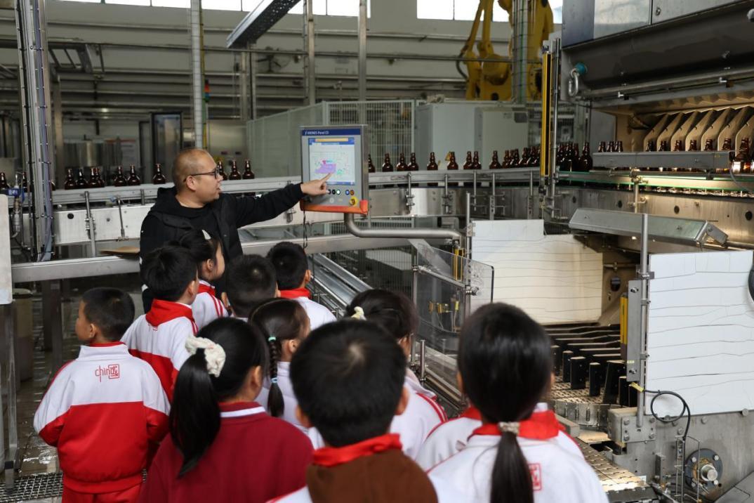 揭牌仪式结束后,小学生们开启了丰富多彩的研学之旅。在啤酒实训中心,孩子们循着麦芽香气,近距离观察从麦芽粉碎到灌装杀菌的全流程生产工艺,专业老师的细致讲解让抽象的工业知识变得生动易懂,孩子们直观感受到了劳动创造价值的深刻内涵。