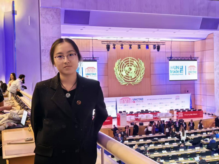 在联合国贸易和发展(UNCTAD)全体会议上,萧羽婷作为青年代表,全程聆听联合国秘书长古特雷斯围绕全球发展关键议题的讲话,形成信息交互与理念共鸣。