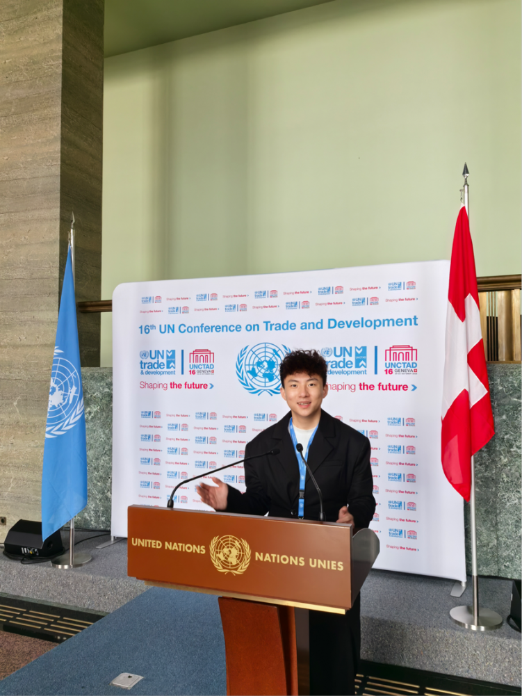 活动中,郭艺轩参加了联合国贸易与发展会议第十六届青年论坛(UNCTAD Youth Forum),与来自全球的青年代表共同探讨“绿色崛起与可持续未来”主题,并在研讨环节中就“经济不稳定下的青年生计创新”发表见解,为青年群体的全球行动贡献了中国智慧。(图文/张娜)