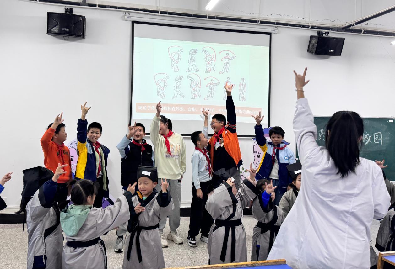 机器人“小鱼”现场演示了AI问病荐药功能:它能通过分析患者症状,结合《伤寒杂病论》等经典典籍推荐药方。孩子们纷纷举手,争先恐后地与这位特殊的“AI中医”互动,直观感受到科技为传统医药注入的崭新活力。在传统五禽戏体验环节,孩子们模仿虎、鹿、熊、猿、鸟的动作,在欢声笑语中,慢慢领悟“天人合一”的中医养生哲学。