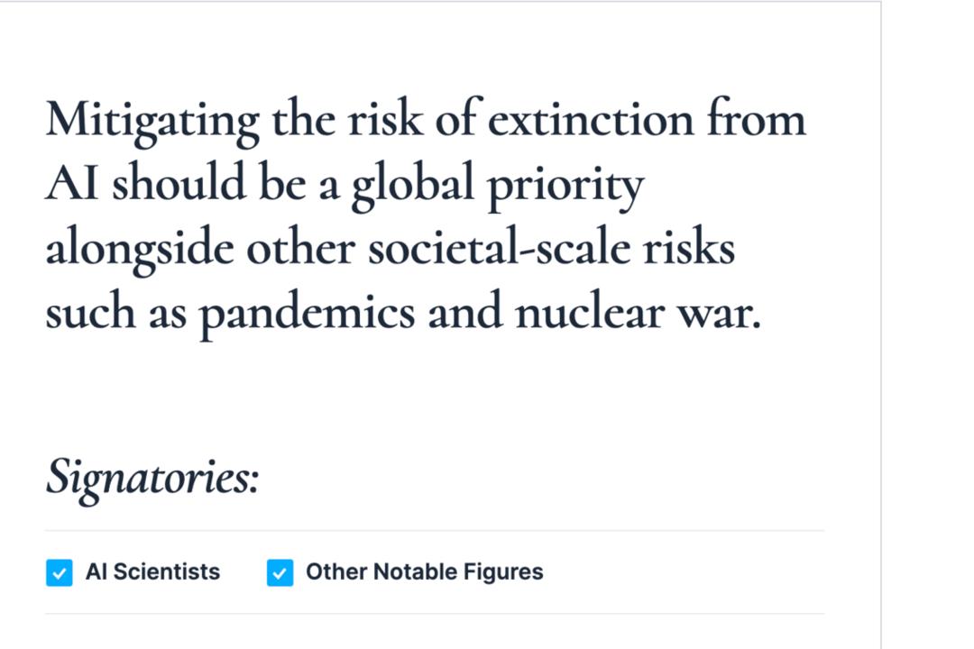 人工智能爆发元年也就是2023年,非营利组织“人工智能安全中心”(Center for AI Safety)也曾发布声明,这份仅有22个英文单词的简短声明称,降低AI可能带来的灭绝风险,应与流行病和核战争等一样成为全球首要任务。当时OpenAI首席执行官山姆、人工智能先驱杰弗里·辛顿、微软首席技术官凯文·斯科特等数百名AI行业的领军人物、学者等共同签署了这份声明。