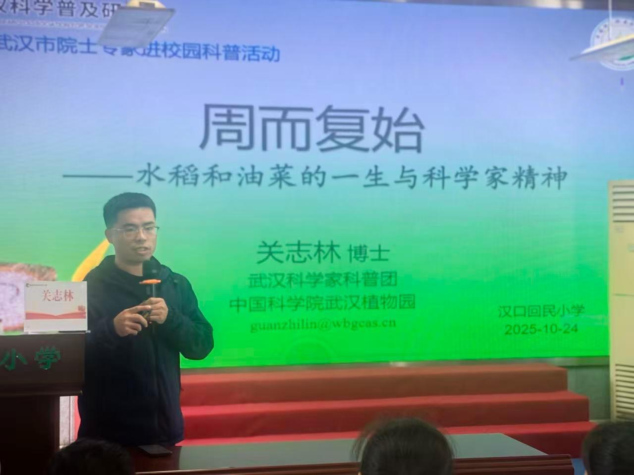 粮食从哪里来?油菜花为何能变成菜籽油?10月24日下午,武汉“院士专家进校园”科普活动走进武汉市汉口回民小学。中国科学院武汉植物园助理研究员关志林博士,以“周而复始——水稻和油菜的一生与科学家精神”为主题,带领学校五、六年级学生探索餐桌上农作物背后的科学故事。