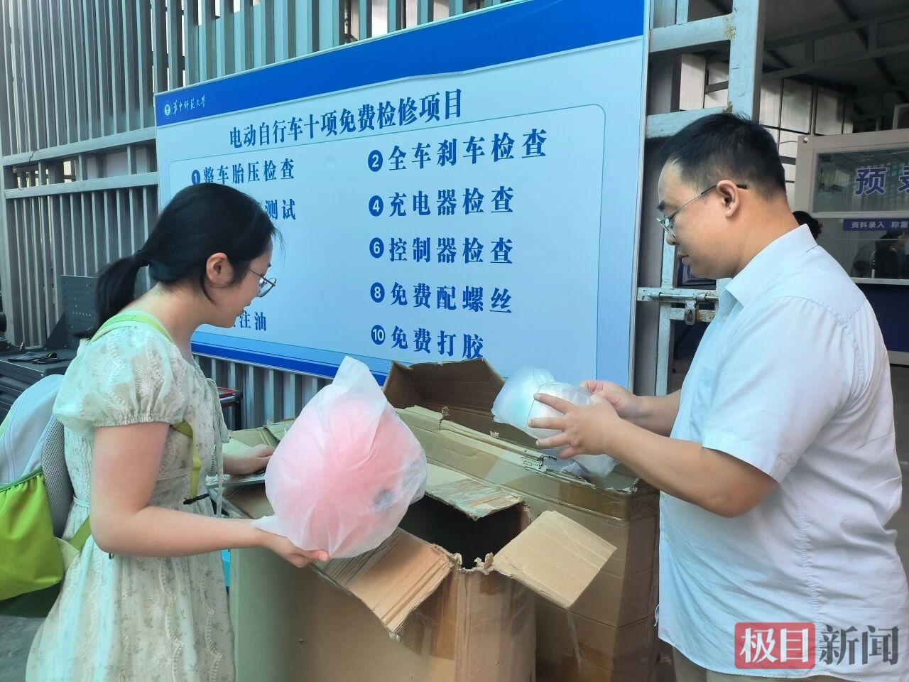 据介绍,服务站为师生提供“整车胎压检查、免费配螺丝、线路排查、电机检查、整车灯光测试、充电器检查、免费注油、免费打胶、全车刹车检查、控制器检查”10项免费维修服务。