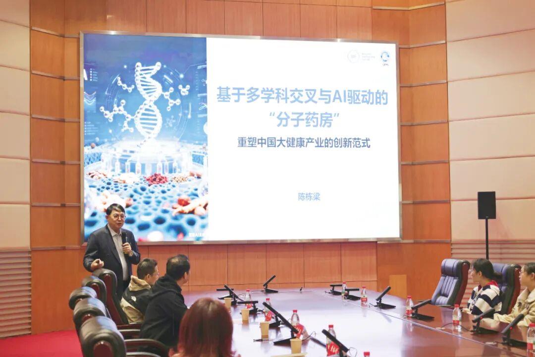聘任仪式后,陈栋梁教授以《基于多学科交叉与AI驱动的“分子药房”》为主题作学术报告。报告紧扣科技前沿,生动呈现了“分子药房”在疾病治疗领域的创新与应用前景,为在场师生带来一场兼具深度与前瞻性的学术讲座。