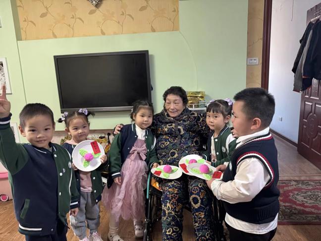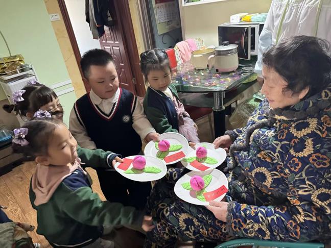 “咚咚咚——”上午9点,5岁的乐乐敲响一位老人的家门,当门缓缓打开时,孩子们齐声喊出“奶奶好”,双手捧上用黏土捏制的“寿桃”,桃尖还点缀着绿色黏土“叶子”。“这是我揉了三次才圆的呢!”乐乐仰着脸说。这位奶奶摸着寿桃上的“绿叶”红了眼眶:“这比真桃子还金贵,奶奶要供起来!”