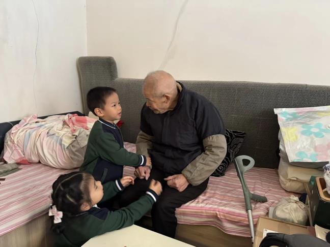 在这些老师家里,孩子们将客厅变成“临时舞台”。随着《青春快出发》的音乐响起,萌娃们蹦跳着完成“摘桃”“送福”等动作。原本坐在沙发上的爷爷忍不住起身,跟着节奏拍手:“这帮小娃娃跳得我腰都酸了,但心里甜!”表演结束,孩子们还为老人捶背,让老人笑得合不拢嘴。