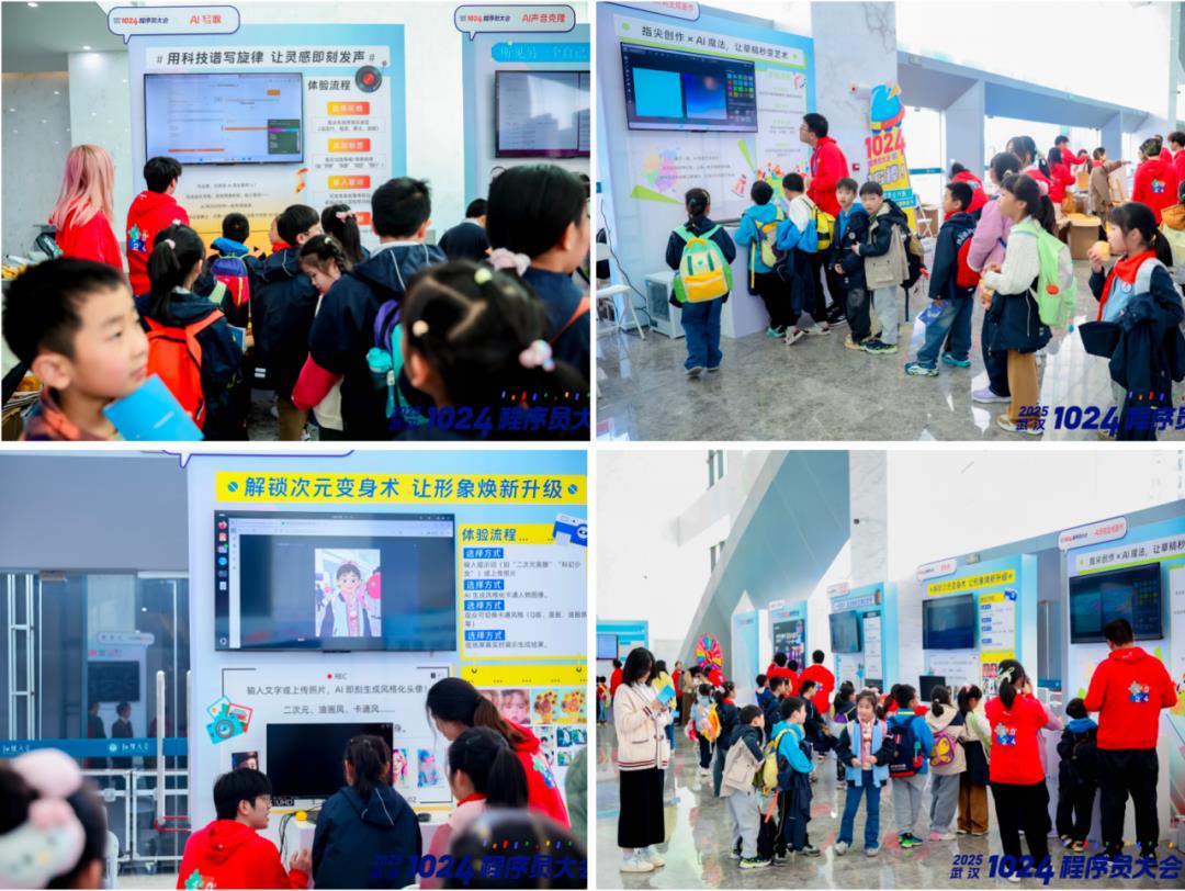 让更多学生感知AI、应用AI、掌握AI,本次大会期间,专门举办“AI大模型体验主题活动”,吸引了江汉大学实验小学、实验中学的200名“小小AI探索员”到场参与。AI写歌、声音克隆、图生图、视频换脸、AI涂鸦生成画作……围绕五大互动展台展开,学生们手持《AI探索护照》集章卡,在现场操作体验AI的创作与交互能力。一场程序员的盛会,也成为学生体验AI应用与学习科技知识的趣味课堂。