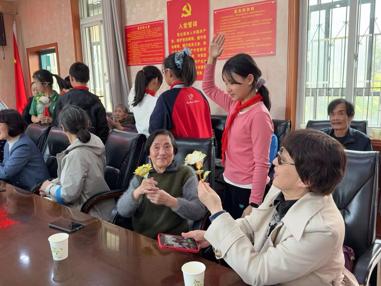 在温馨的献礼环节,学生们手捧亲手制作的手工作品,向退休教师致以诚挚的问候。一个队礼、一个拥抱、一份心意,凝聚着孩子们浓浓的感恩之情。“这是我收到最珍贵的重阳礼物。”退休李老师激动地说,“孩子们的用心,让我们倍感温暖。”