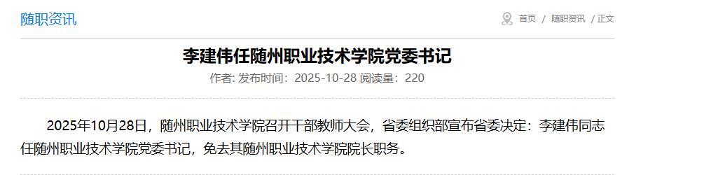 据随州职业技术学院官网消息:10月28日,随州职业技术学院召开干部教师大会,省委组织部宣布省委决定:李建伟同志任随州职业技术学院党委书记,免去其随州职业技术学院院长职务。