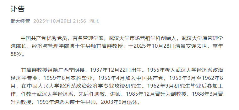中国共产党优秀党员,著名管理学家,武汉大学市场营销学科创始人,武汉大学原管理学院院长,经济与管理学院博士生导师甘碧群教授,于2025年10月28日清晨安详去世,享年88岁。