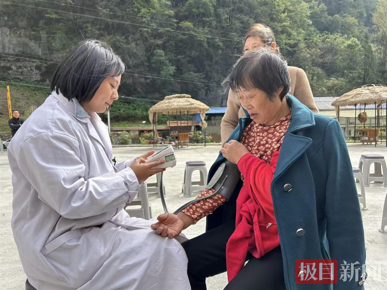 现场还有一个摊位,聚集了众多老人。这里是由乡卫生院、驻村医生组成的医疗团队,为老人们提供免费量血压、血糖检测及健康咨询。针对老年人常见慢性病,现在用多种方式进行科普宣教,真正做到把健康服务送到了“家门口”。
