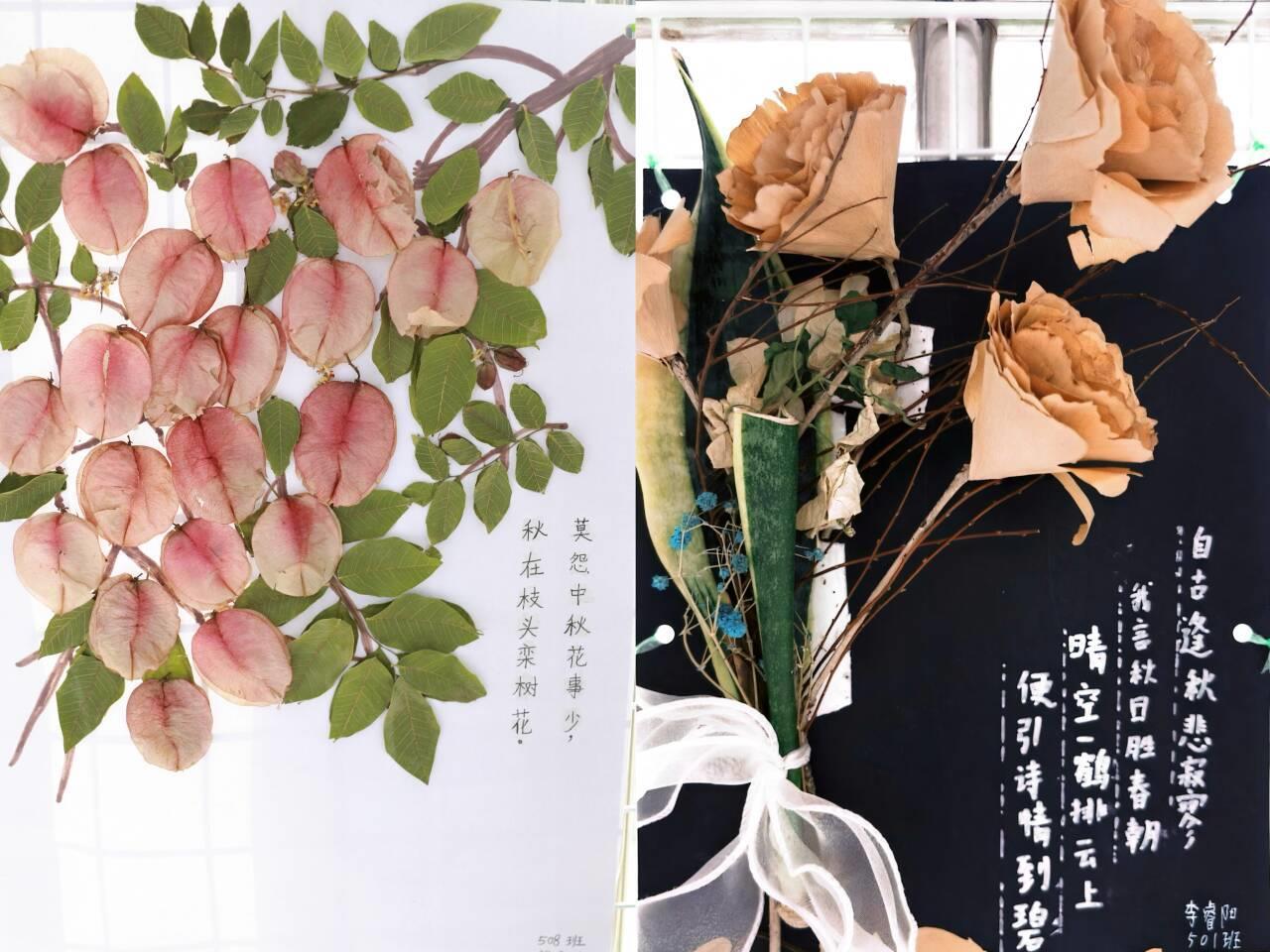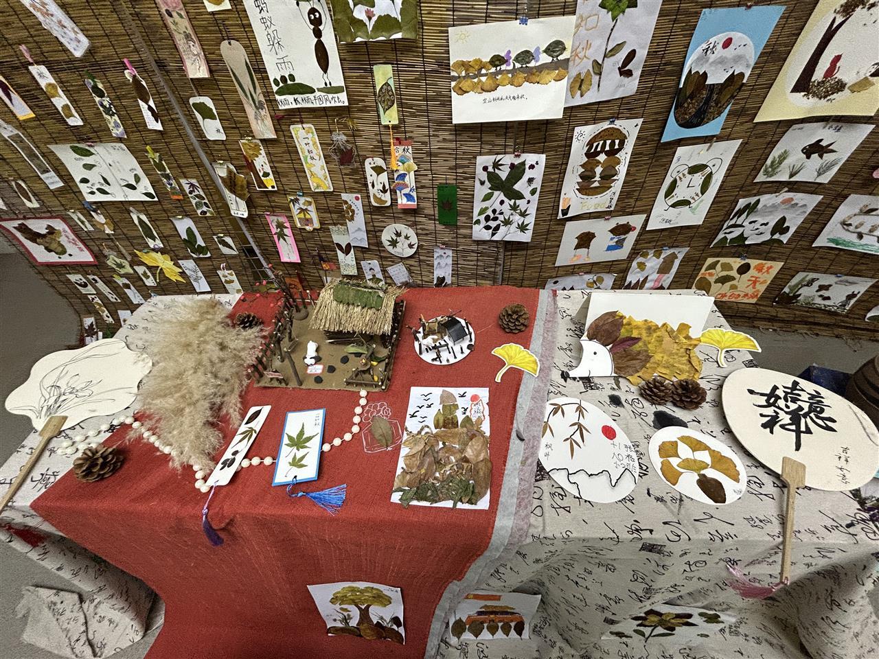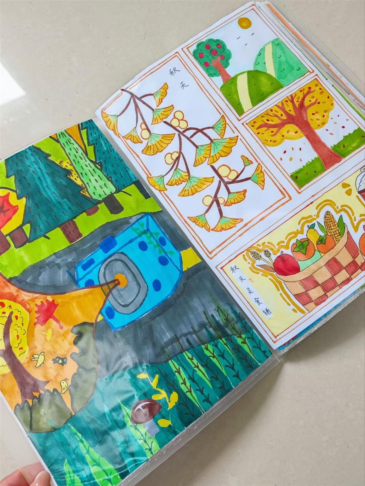 各年级学生以不同方式“收藏”秋天,展现出丰富的想象力与创造力。低年级孩子在“秋日趣多多”游园会中合作搭建树叶帐篷、展示亲子树叶面具,并在“一叶知秋”工坊中制作充满童趣的“秋语书签”;三、四年级学生则走进“秋日印象馆”,围绕秋天的风景、人物与故事,运用水彩、素描、国画等多种绘画方式,描绘眼中的季节印象;高年级学生收集落叶、干花、松果等自然信物,制作“秋日手札”,并将它们与原创诗歌结合,实现自然物与文字的诗意共鸣。
