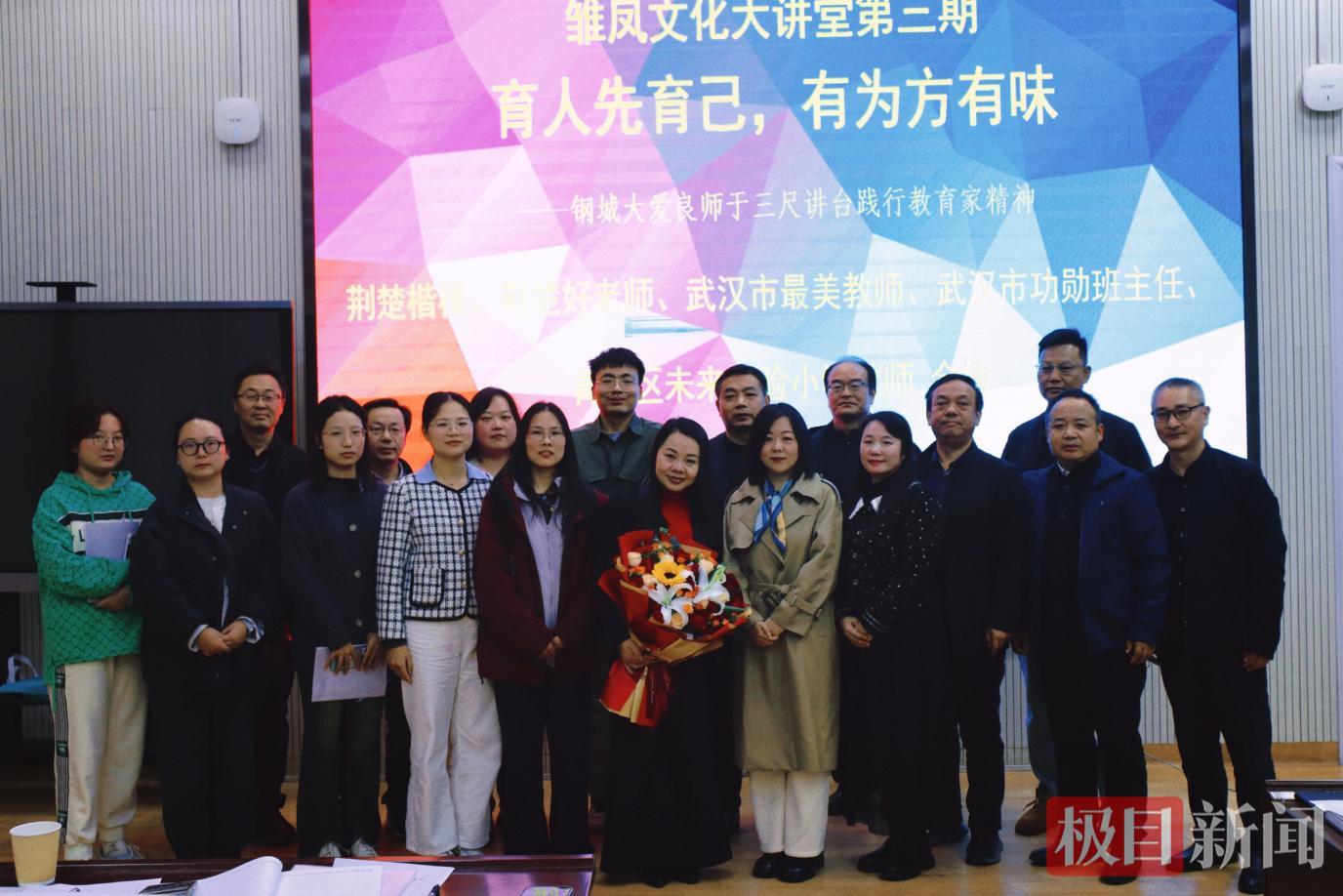 10月30日下午,武汉市青山区钢城二中报告厅暖光萦绕,“雏凤文化大讲堂”第三期活动如期举行。荆楚楷模、武汉市功勋班主任余婧老师受邀带来《育人先育己》主题分享,青山区教育局基教科领导、武钢实验教联体代表、钢城二中全体师生及“妈妈读书会”家长齐聚现场,共同聆听她扎根教育一线的生命日记,感受“育人先育己,有为方有味”的教育深情。