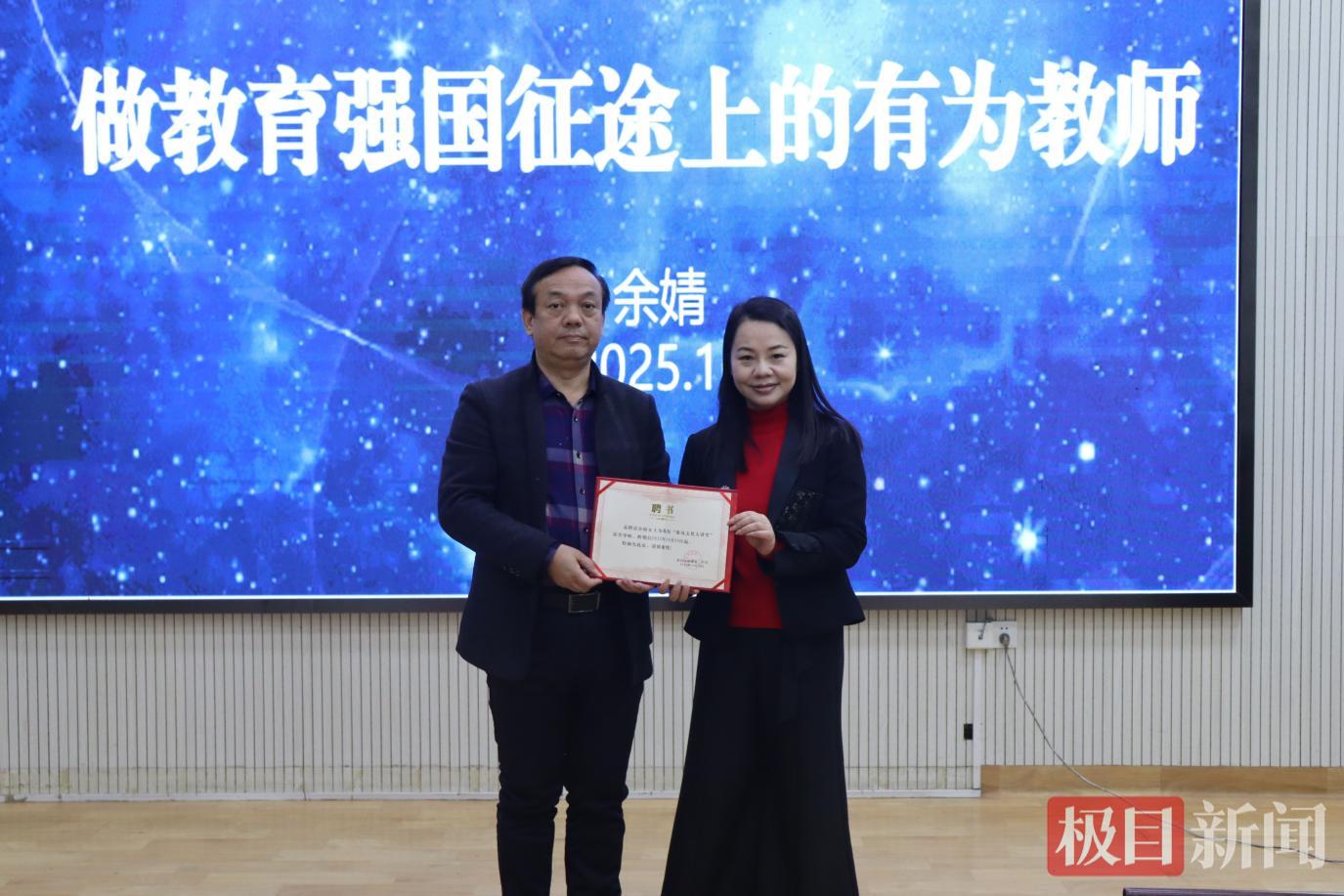 活动伊始,钢城二中李培根书记为余婧老师颁发“雏凤文化大讲堂”导师聘书。接过聘书的余婧,指尖还留存着纸张的温度,一句感言便让全场静了下来:“一辈子做老师,一辈子做好老师。偶感疲惫,始终热忱;偶有迷茫,从未退却;偶有委屈,依旧赤诚。”