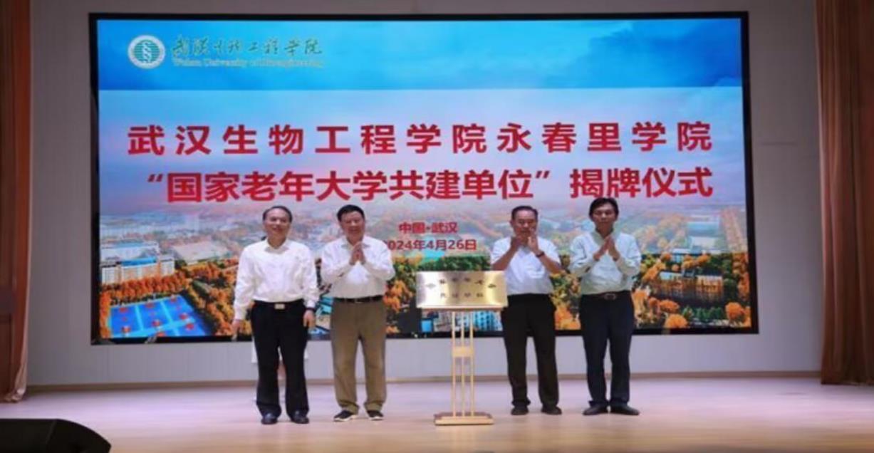回眸:2024年4月26日,中国民办教育协会名誉会长李连宁(右二),湖北省人民政府原副省长王少阶(左二),省教育厅副厅长、一级巡视员张金元(左一),校理事长兼永春里学院院长余毅(右一)共同为“国家老年大学共建单位”揭牌。