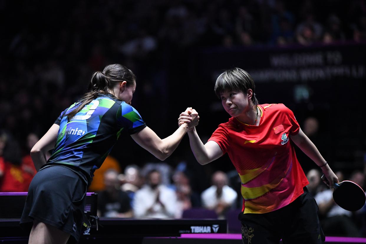 11月2日,中国选手王艺迪(右)和德国选手沙宾·温特握手。新华社记者 连漪 摄