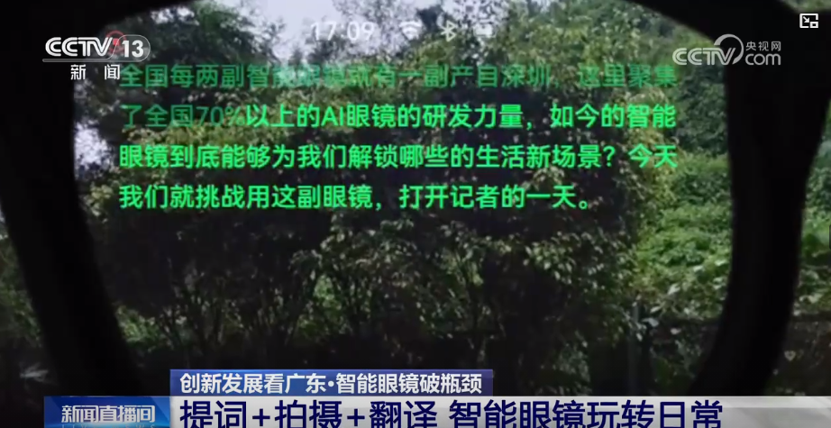 全国每两副智能眼镜就有一副产自深圳,这里聚集了全国70%以上的AI眼镜的研发力量。记者戴上眼镜即使是在户外光线之下,都可以清晰地看到屏幕上的提词器,同时它也随着记者的语速自然地调节,提词功能,稳稳拿捏。