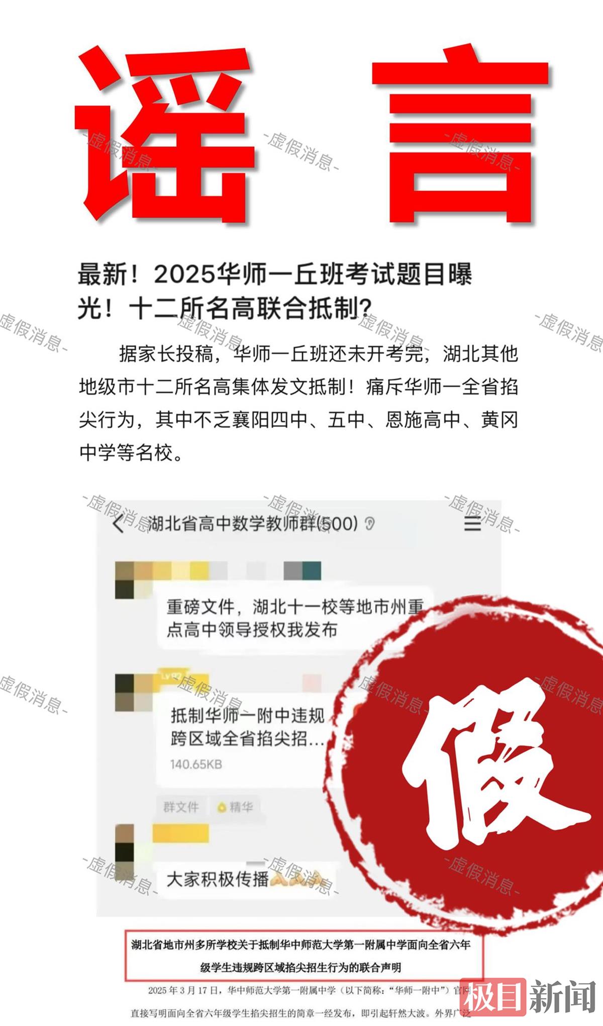 2025年4月,网络平台出现一篇题为《湖北省地市州多所学校关于抵制华中师范大学第一附属中学面向全省六年级学生违规跨区域掐尖招生行为的联合声明》的虚假文章。