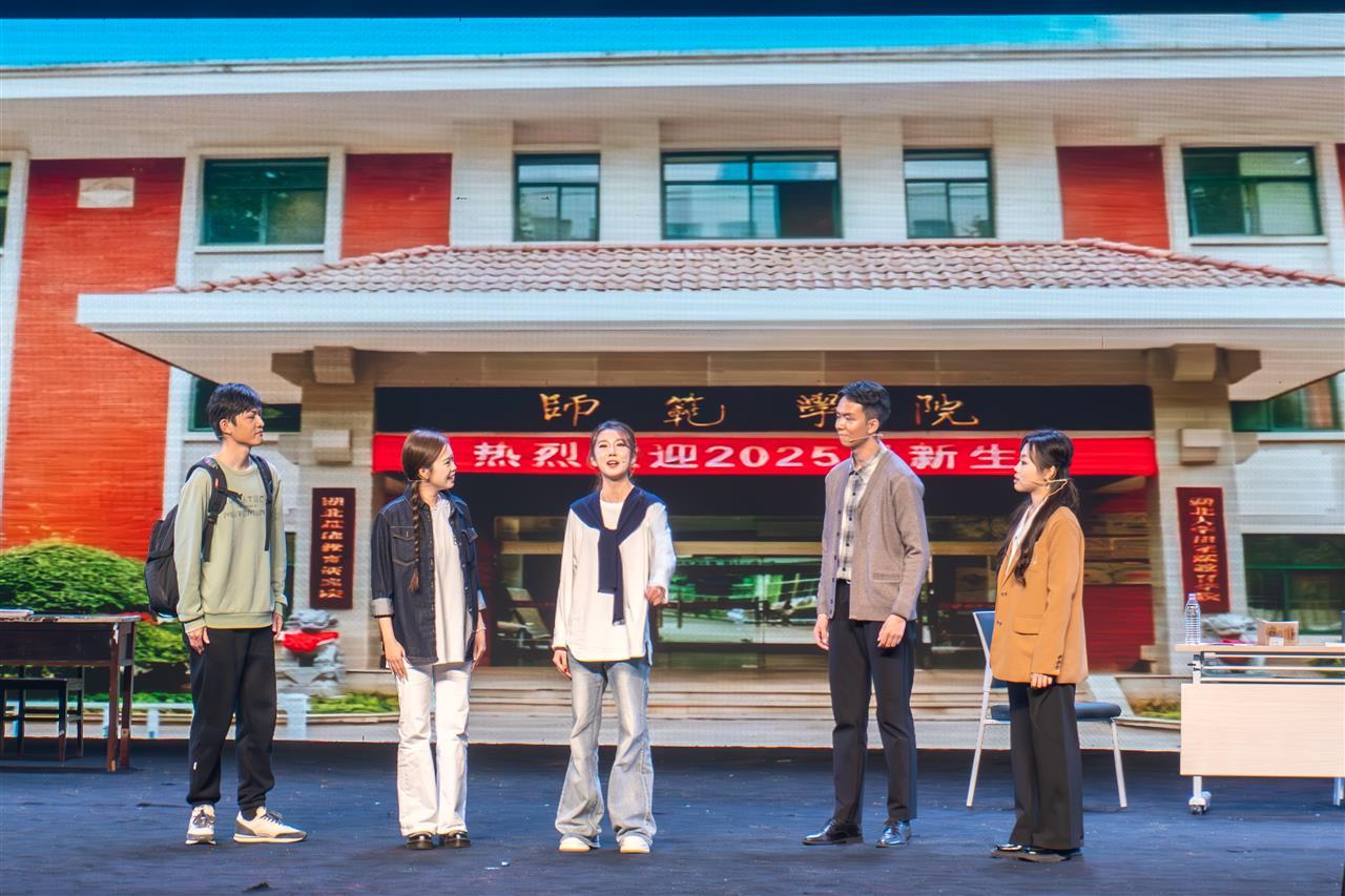舞台上,主人公欣语完成了从懵懂新生到“师声琅琅”宣讲团团长的蜕变:面对陈老师“教育的底色是真诚”的叮嘱,她眼中的迷茫渐渐褪去;见支教学姐一然收到乡村学生小川寄来的手工鞋垫,她悄悄握紧了拳头;随着成长,她读懂了扎根乡镇中学三十余载的父亲,理解了他“一生交给讲台”的坚守;当她以宣讲团团长的身份,讲述着湖大校史中一代代教育者的坚守故事时,言语中满是对教育事业最纯粹、最炽热的热爱。话剧落幕,台下爆发出雷鸣般掌声。