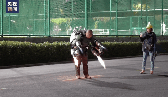 伴随着一阵轰鸣,一名男子背着一个“大包”,双臂张开,只见他用力一蹬,竟飞到了离地近两米的半空中,并稳稳悬停!