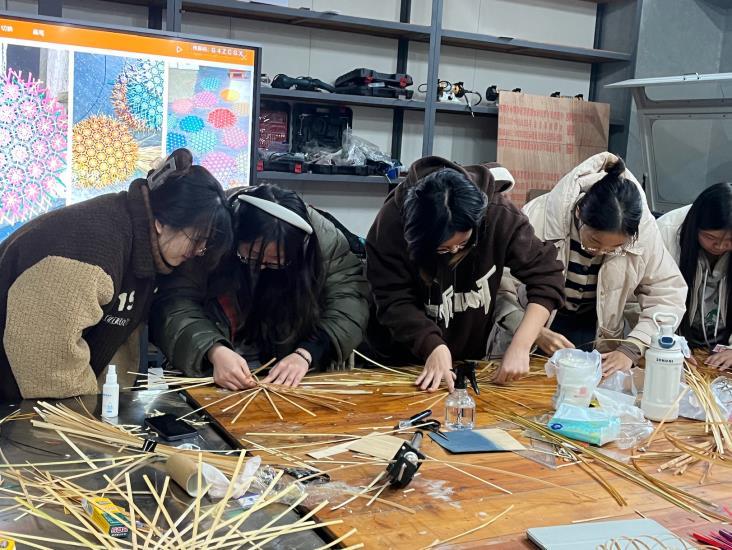 在竹编项目实践中,来自鄂湘赣皖四省的24位非遗传承人与40多位师生组成跨界团队。传承人亲授“挑压编”“穿插编”等核心技法,师生团队则运用现代设计思维,开发出竹编灯具、宝宝椅、首饰等符合当代审美的系列产品,探索出“传承人+设计师”协同育人的有效路径。