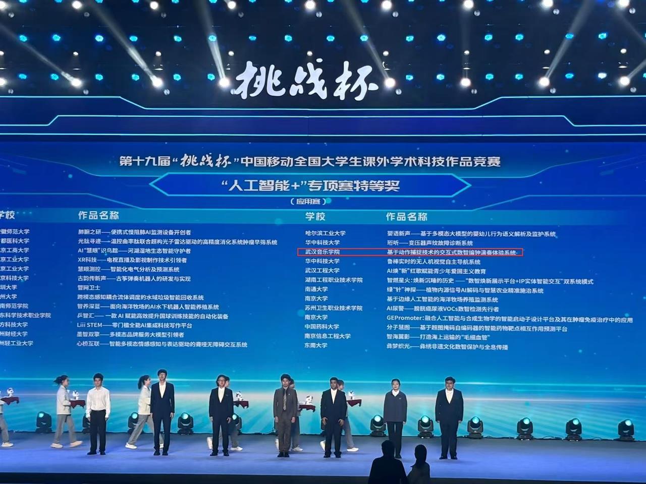 11月3日,第十九届“挑战杯”中国移动全国大学生课外学术科技作品竞赛终审决赛在南京大学落幕。武汉音乐学院入围项目“基于动作捕捉技术的交互式数智编钟演奏体验系统”获“人工智能+”专项赛(应用赛)特等奖,实现了学校在“挑战杯”赛事上的历史性突破。