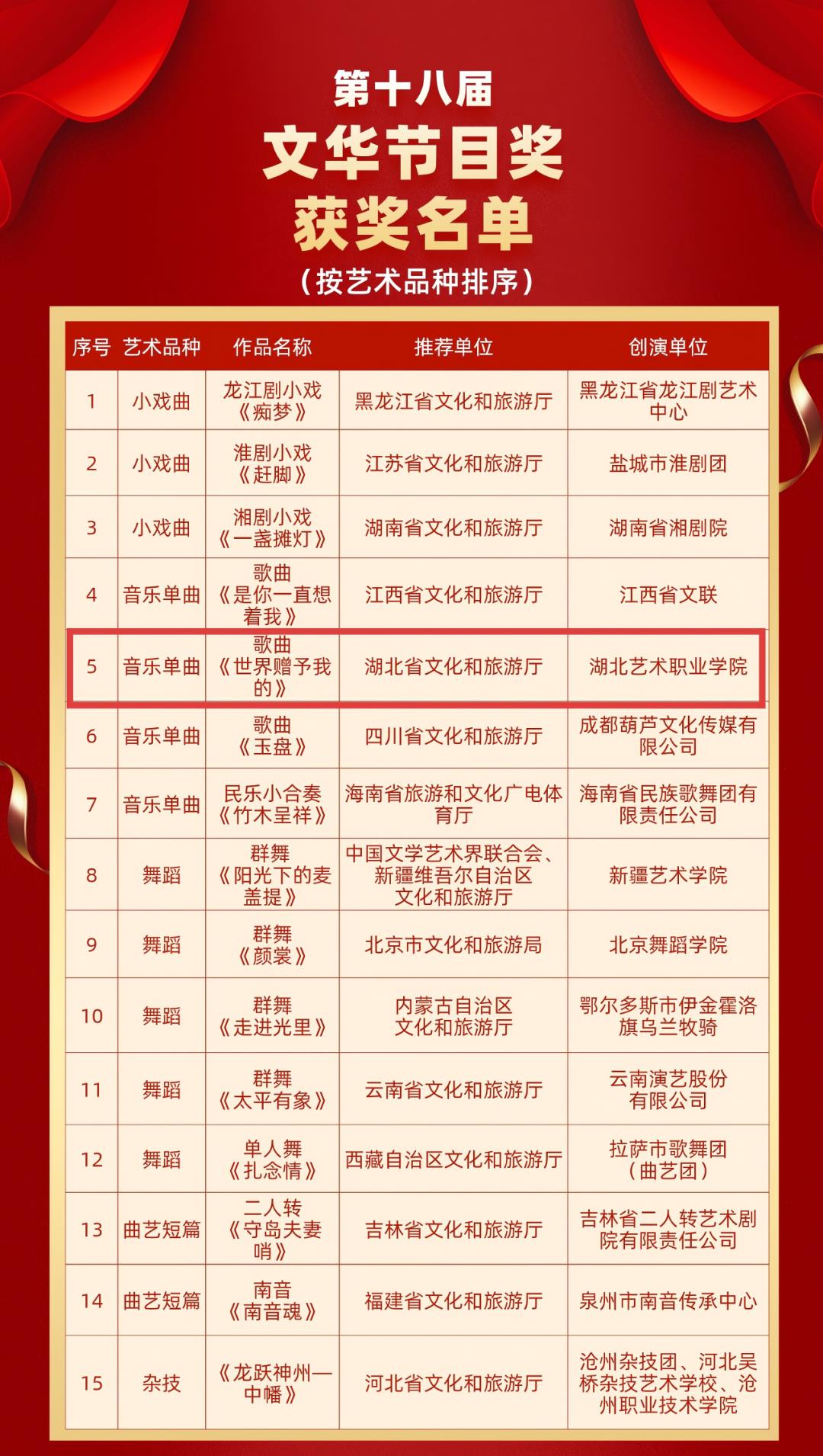 11月4日晚,由文化和旅游部、重庆市人民政府、四川省人民政府主办的第十四届中国艺术节在重庆闭幕,闭幕式上揭晓了第十八届文华奖获奖名单,并为53个获奖作品(含剧目奖、节目奖、单项奖)颁奖。此次湖北共摘得3个奖项,取得近十年来湖北省参评文华奖的最好成绩。其中,湖北艺术职业学院创作演出的歌曲《世界赠予我的》获文华节目奖,湖北艺术职业学院(以下简称为“湖艺”)与湖北省歌剧舞剧院联合创演的舞剧《乐和长歌》获文华音乐奖。湖艺成为全国高校中唯一一所2部作品同时获此殊荣的院校。