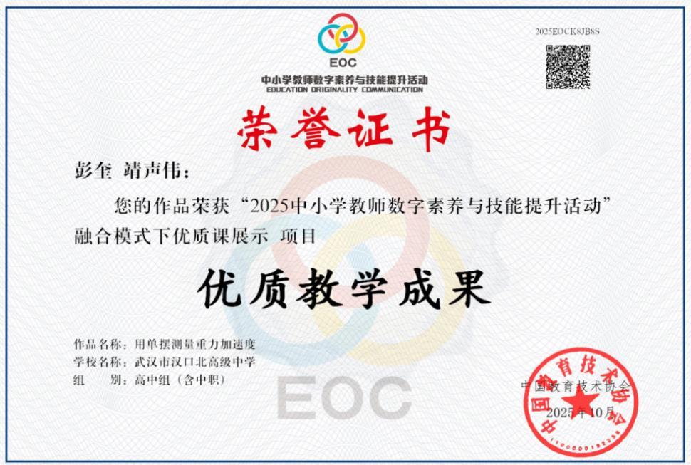 近日,在由中国教育技术协会主办的“2025中小学教师数字素养与技能提升活动”中,武汉市汉口北高级中学物理教师彭奎、靖声伟凭借课程《实验:利用单摆测量重力加速度》,荣获“融合模式下优质课展示”项目“优质教学成果”奖,充分展现了该校在教育数字化转型与课堂教学改革方面的积极成效。
