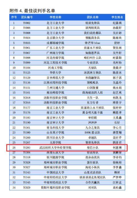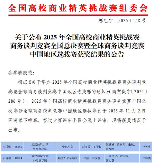 11月2日,2025年全国高校商业精英挑战赛商务谈判竞赛全国总决赛暨全球商务谈判竞赛中国地区选拔赛圆满落幕。武汉纺织大学外经贸学院现代商务学部参赛团队获得本科组国赛一等奖1项、三等奖1项,1名学子获评“最佳谈判手”称号。