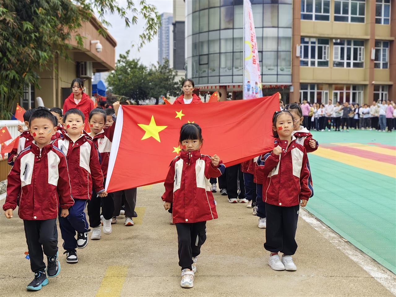 本次运动会以“荷润思政”为核心,融合军事元素与亲子运动,打造教育、趣味、互动兼具的特色活动。开幕式上,“超人”教官带动全场氛围,国歌奏响时五星红旗冉冉升起,爱国情怀在孩子心中萌芽;随后大班特色方队(国旗、神枪手等)持自制“装甲车”“坦克”模型登场,中班方队斗志昂扬,小班萌娃气场十足,尽显小军人风采。