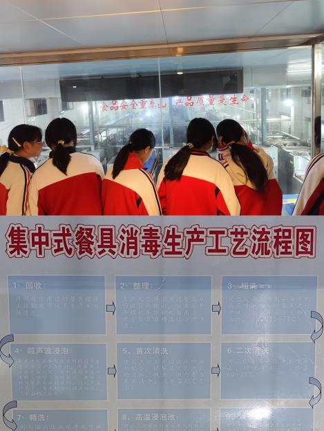 随后,师生们步入参观通道,透过玻璃幕墙全程观摩了餐具消毒的11道标准化工序。从餐具回收暂存、人工分拣除渣,到高温蒸汽消毒、热风烘干,再到自动包装与出厂检验,每一道环节都井然有序、严谨规范。当了解到高温消毒环节需持续10分钟以上、确保杀灭大肠杆菌和沙门氏菌等致病性微生物时,同学们纷纷感叹:“原来我们每天用的食堂饭盒,要经过这么多道‘关卡’!”