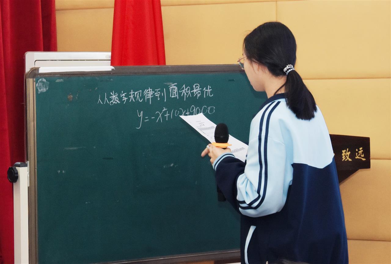 横店实验学校刘欣老师执教的《从数字规律到面积最优——二次函数最大值模型的应用》一课,以教材中的数学活动为蓝本,引导学生从简单的数字规律出发,逐步抽象出二次函数模型,最终落脚于“面积最优”这一现实问题。课堂上,学生们动手操作、小组激辩、自信表达,在真实的“做数学”与“用数学”中,不仅深化了对模型思想的理解,更真切体会到数学源于生活、用于生活的价值。