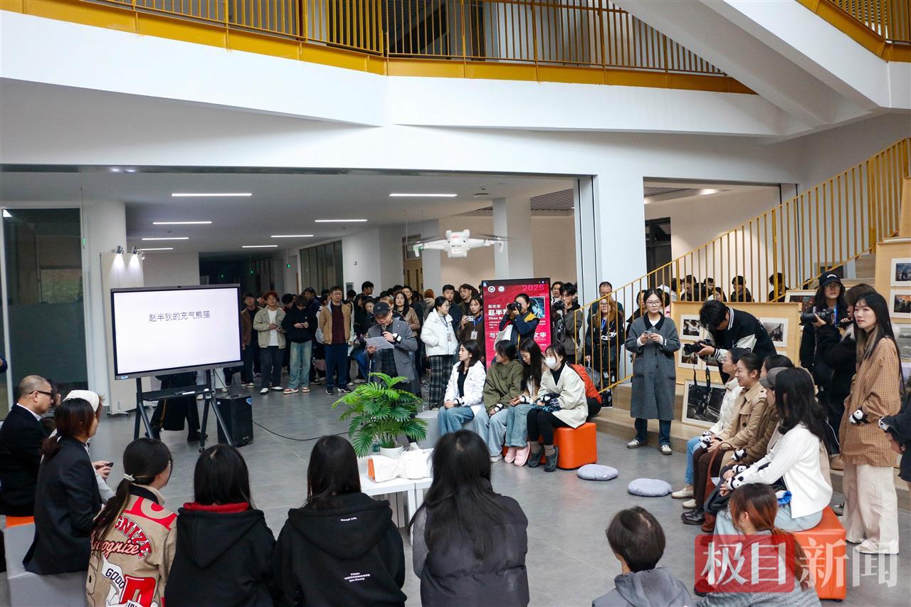 赵半狄曾以“打工熊猫”雕塑在北京CBD走红,此次进驻校园的“泞”熊猫造型舒展而充满力量,被同学们亲切称为“冲仔”,迅速成为校园新晋打卡点。剪彩仪式后举行的交流会上,赵半狄与师生围坐畅谈,分享创作理念:“‘泞’熊猫是我内心状态的投射——它前倾的姿态象征着积极行动的精神内核,背影中那一份‘拧劲儿’,正是对年轻人不屈服、勇往直前状态的写照。”