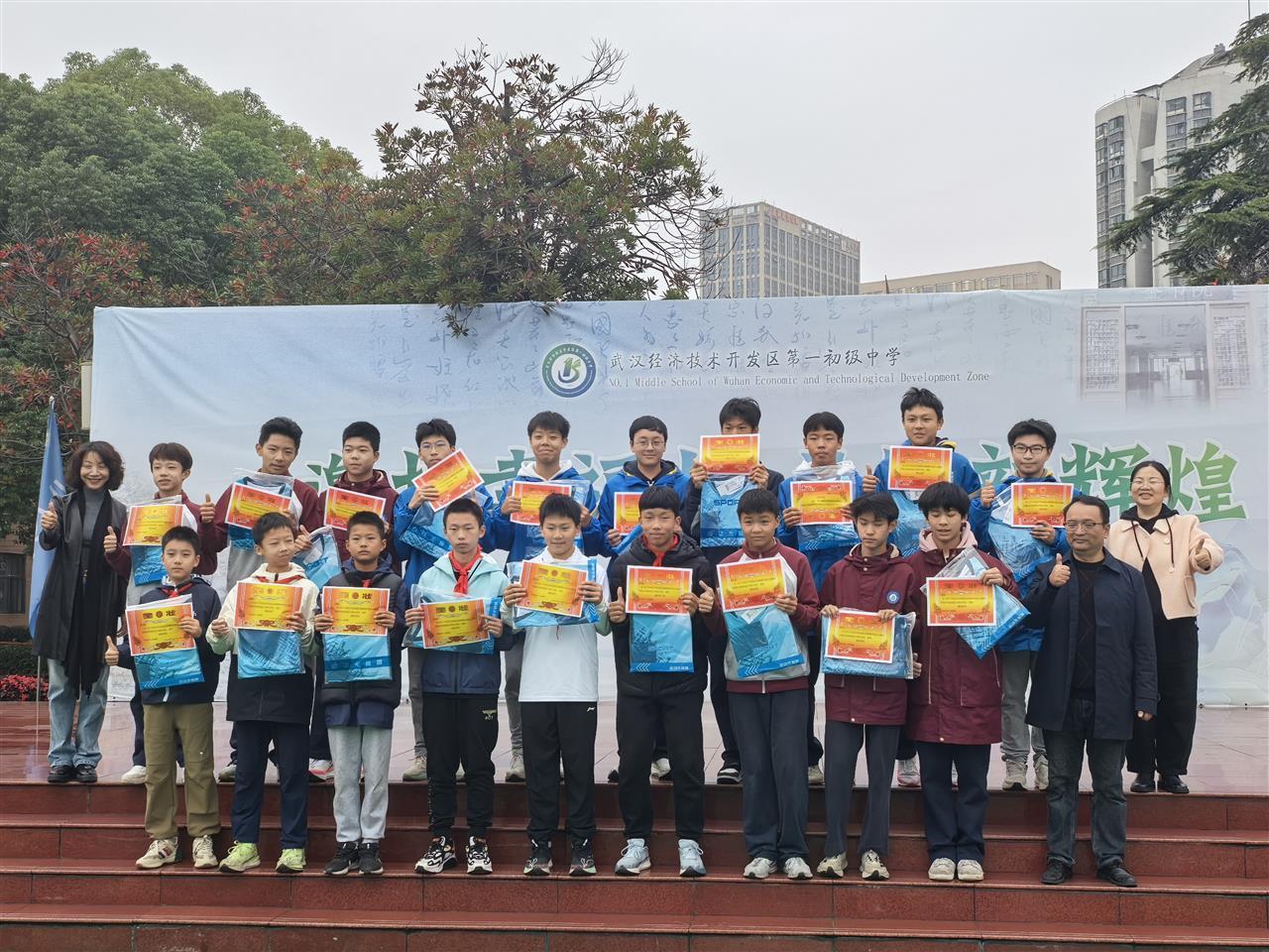 比赛结束后,经开区教育局党委书记、局长熊白莉,经开区教育局党委委员、副局长周鸣,经开区教育局党委委员韩瑾,经开区教育局综合办公室负责人晏琳,经开区教育局体卫艺中心负责人彭捷来到经开一初,为勇夺市级总决赛冠军的队员们、默默耕耘的班主任们及教练员们颁奖。