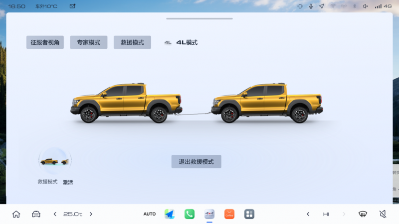 热爱越野的你,是否曾在野外陷车时感到束手无策?是否期待在拔河竞赛中释放更强牵引力?此次升级,山海炮Hi4-T车型新增了救援模式,让每一次救援都更高效、更有力。该模式基于驱动与防滑技术,可实现车轮稳定滑动,使车辆在救援、拔河场景下发挥更大的牵引力,在陡坡攀爬场景以稳定速度攀爬。开启方式也非常简单便捷:进入4L低速四驱模式后,在“越玩越野”界面一键激活救援模式。