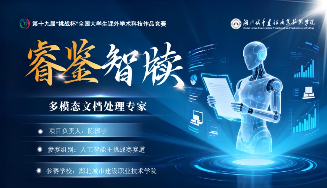 近日,第十九届“挑战杯”全国大学生课外学术科技作品竞赛终审决赛在南京大学举行。湖北城市建设职业技术学院“睿鉴智牍——多模态文档处理专家”项目凭借扎实的技术创新与精准的应用价值,在众多参赛作品中脱颖而出,荣获“人工智能+”专项赛挑战赛一等奖。这是该校项目首次入围“挑战杯”国赛决赛并荣获一等奖,创造了参赛以来的最佳成绩。