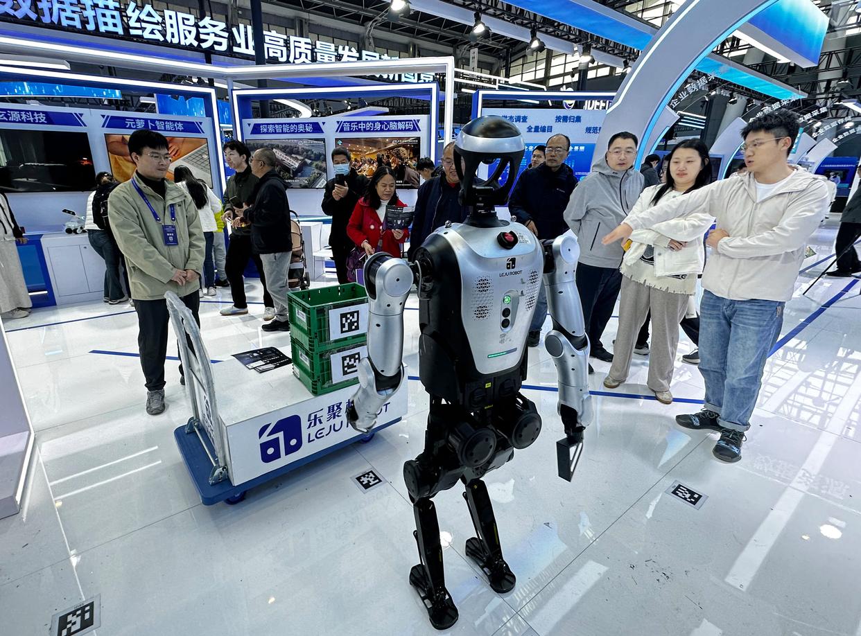 张鸿伟(右一)在2025中国国际数字经济博览会上为观众介绍“夸父”机器人。张鸿伟介绍