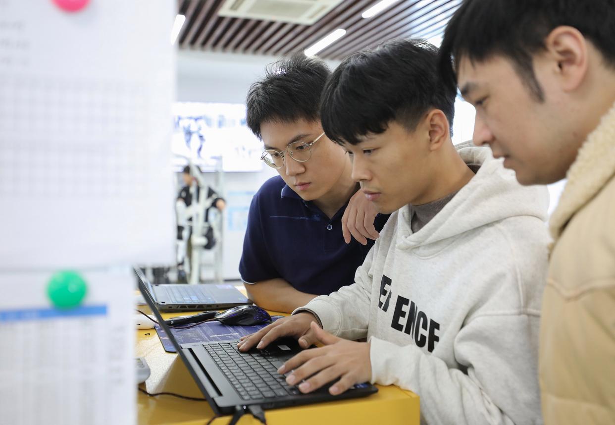 张鸿伟(左)和同事一起研究人形机器人的运行数据,查找测试中出现失败的原因。经过反复测试调整