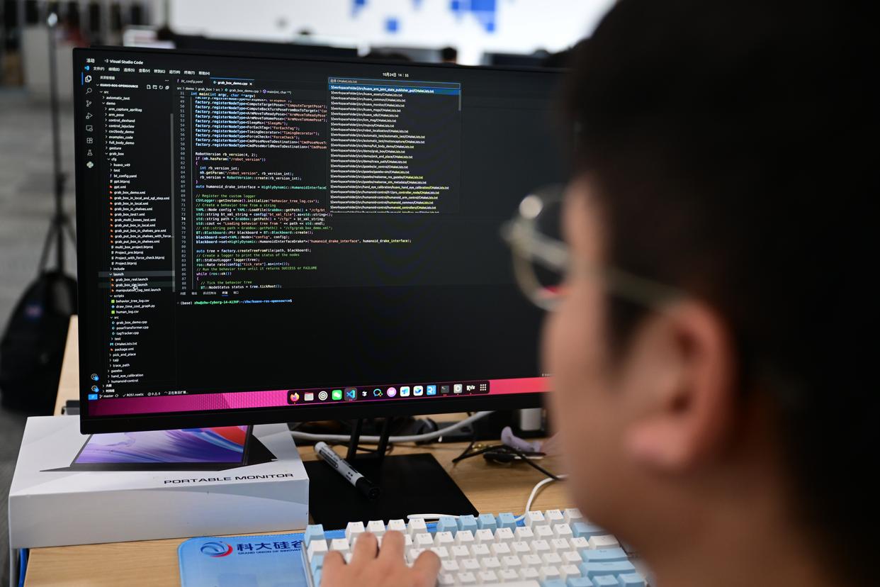 张鸿伟查看电脑上人形机器人的运行数据。2022年人社部公示