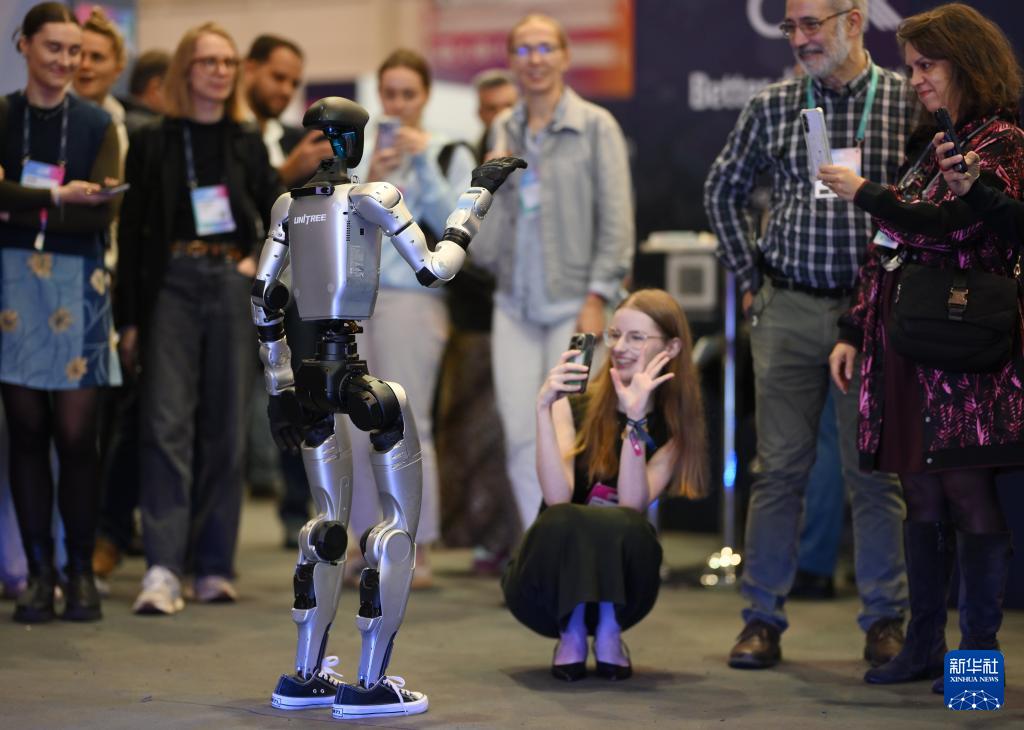 11月12日,在葡萄牙里斯本,中国企业宇树科技的人形机器人和与会者在2025年网络峰会现场互动。新华社发(主办方供图)