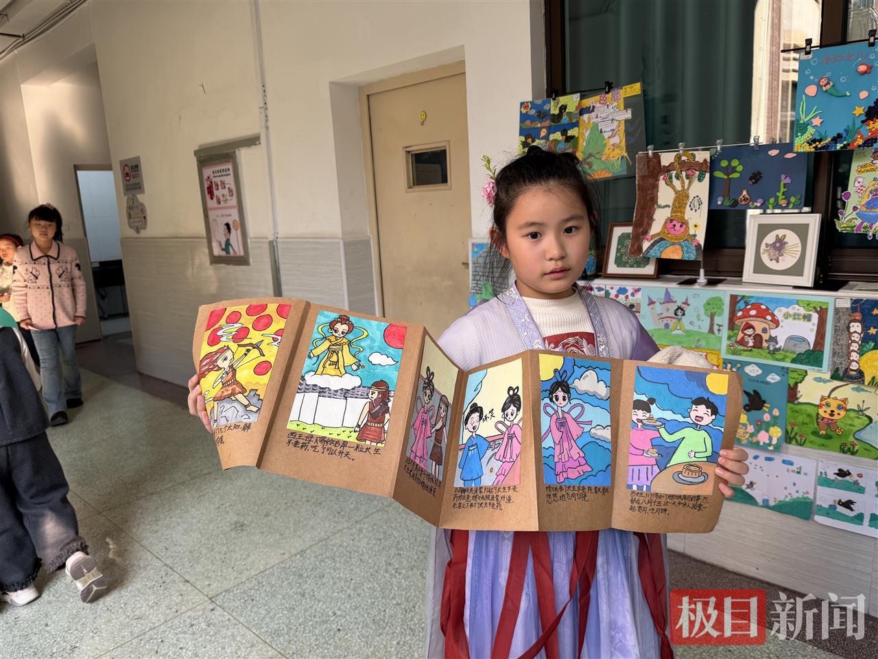 “我们将班级装扮成了书店的样子,营造了浓浓的阅读氛围,前来打卡的师生都很享受这种氛围。”一年级(4)班班主任杨灵菲说。四年级(4)班的学生罗望舒用卡纸制作了折叠手工连环画,讲述嫦娥奔月的故事。罗望舒自信地向周围师生推介:“这个连环画结合了故事、绘画和剪纸来创作,为了参加读书节,我还穿着嫦娥的衣服,拿着手工兔子玩偶呢!”