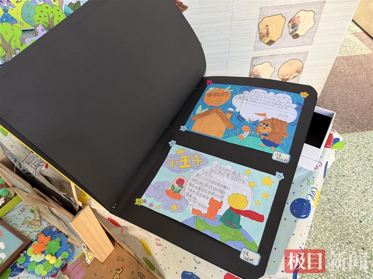 该校德育主任喻红豆介绍,不同年级围绕各自主题完成阅读任务,各具特色。四年级以神话故事为主题,不少班级举行了神话人物服装秀,走廊里的黑板报也展示着学生们的学习成果。六年级的主题是和名家对话,二年级则是“童话”主题,不少班级制作了精美的“纪念册”。
