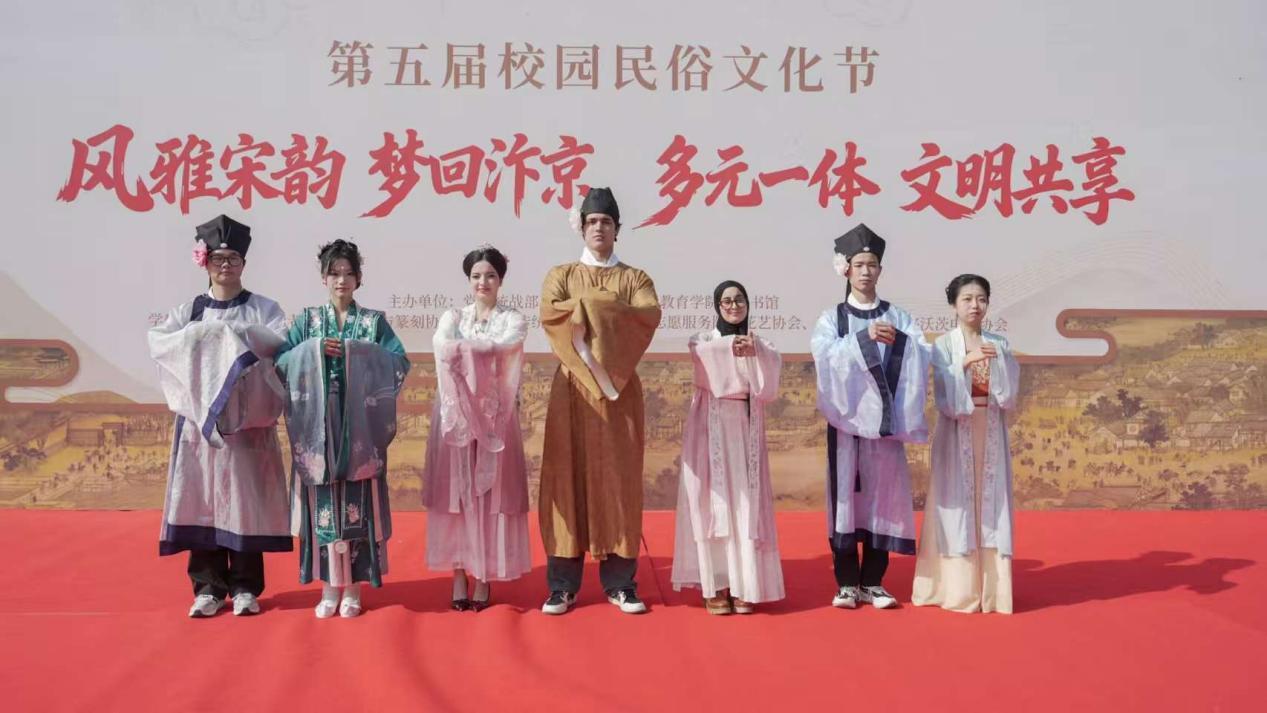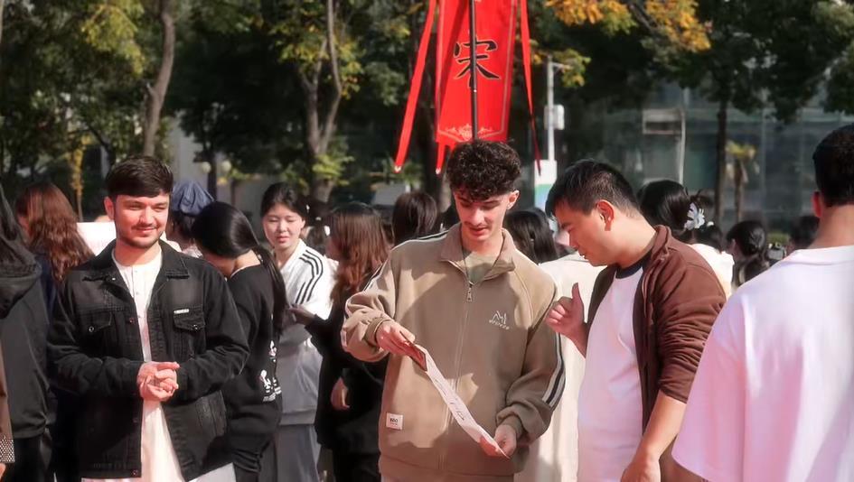 这股跨越时空的文化魅力,也深深吸引了国际学生的热情参与。他们身着汉服,在“大宋朋友圈”背景墙前打卡,努力用中文吟诵着苏轼、李清照的词句。“我从诗里学到了很多很好的词语。”国际学生兰华用流利的中文分享感受。来自摩洛哥的范月希则对仪式中的庄重感印象深刻:“我真的很喜欢中国人庆祝仪式的方式,尊重且庄重。”