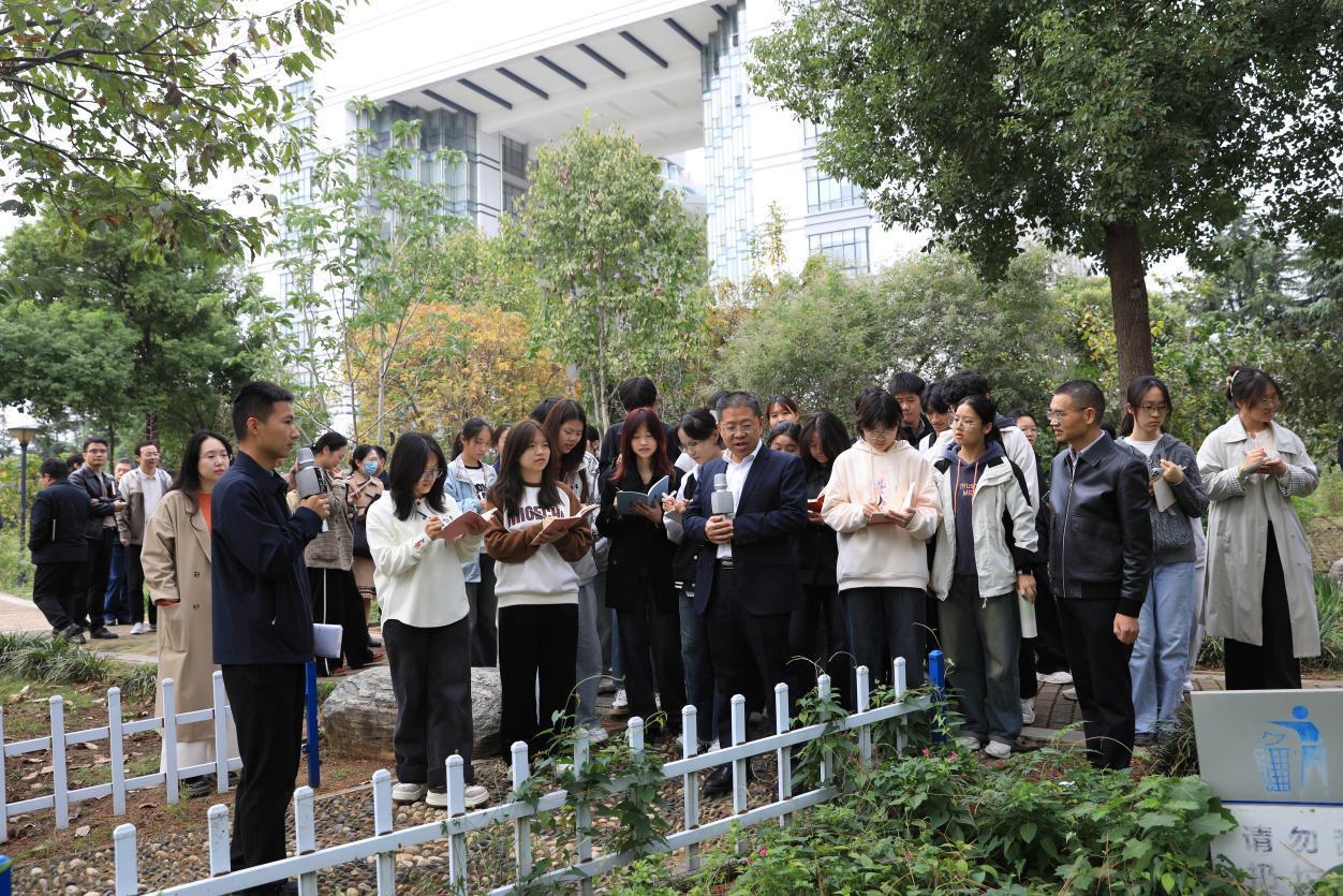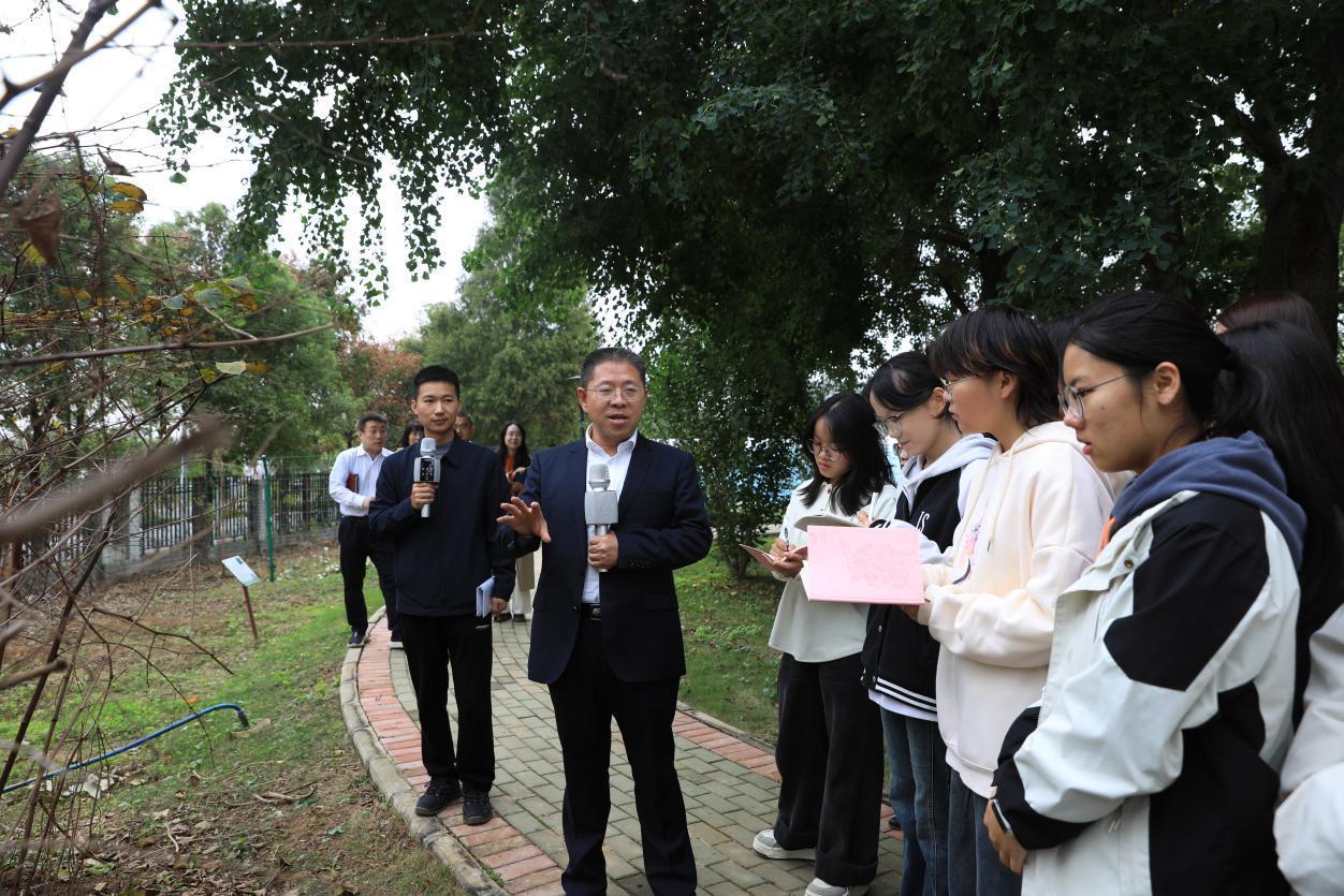 在“药园心知”环节,陈刚带领学生漫步药用植物园,结合各类药用植物特性,细致讲解中医药与心理健康的相关知识,引导学生探寻中医理论中“药食同源”“身心合一”的健康智慧,让大家在亲近自然、辨识本草的过程中加深了对中医药文化的理解。