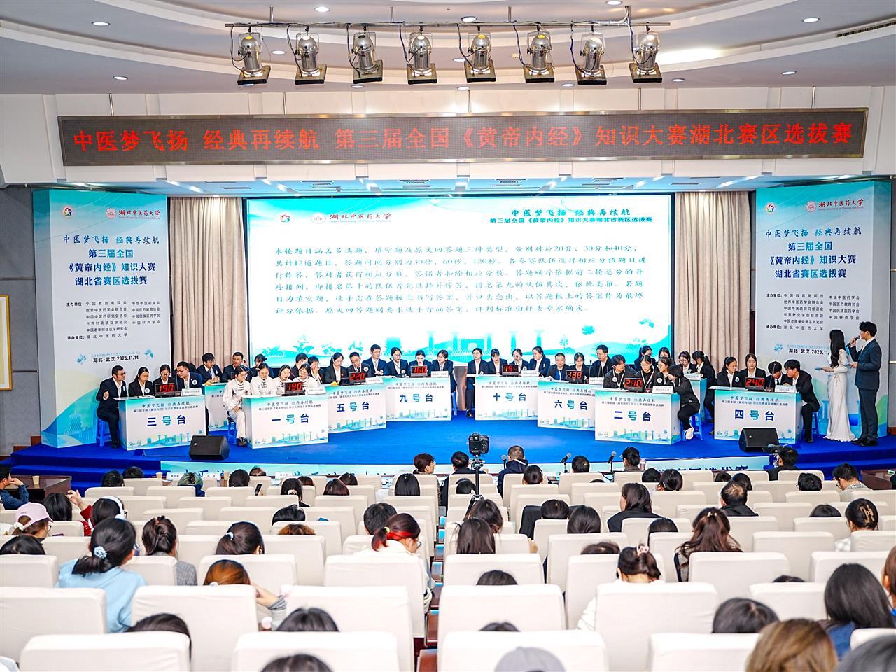 据悉,本次比赛由全国中医药高等教育学会、中华中医药学会、世界中医药学会联合会、中国教育电视台等单位联合主办,湖北中医药大学承办,湖北国药中联医药有限公司支持。此次比赛不仅为全省中医药从业者和学生提供了交流学习的平台,更推动了《黄帝内经》等中医经典的传播与应用,助力湖北中医药事业传承创新发展。脱颖而出的优秀队伍将代表湖北省参加中部区域赛,在更大舞台展现荆楚中医药人才的风采。