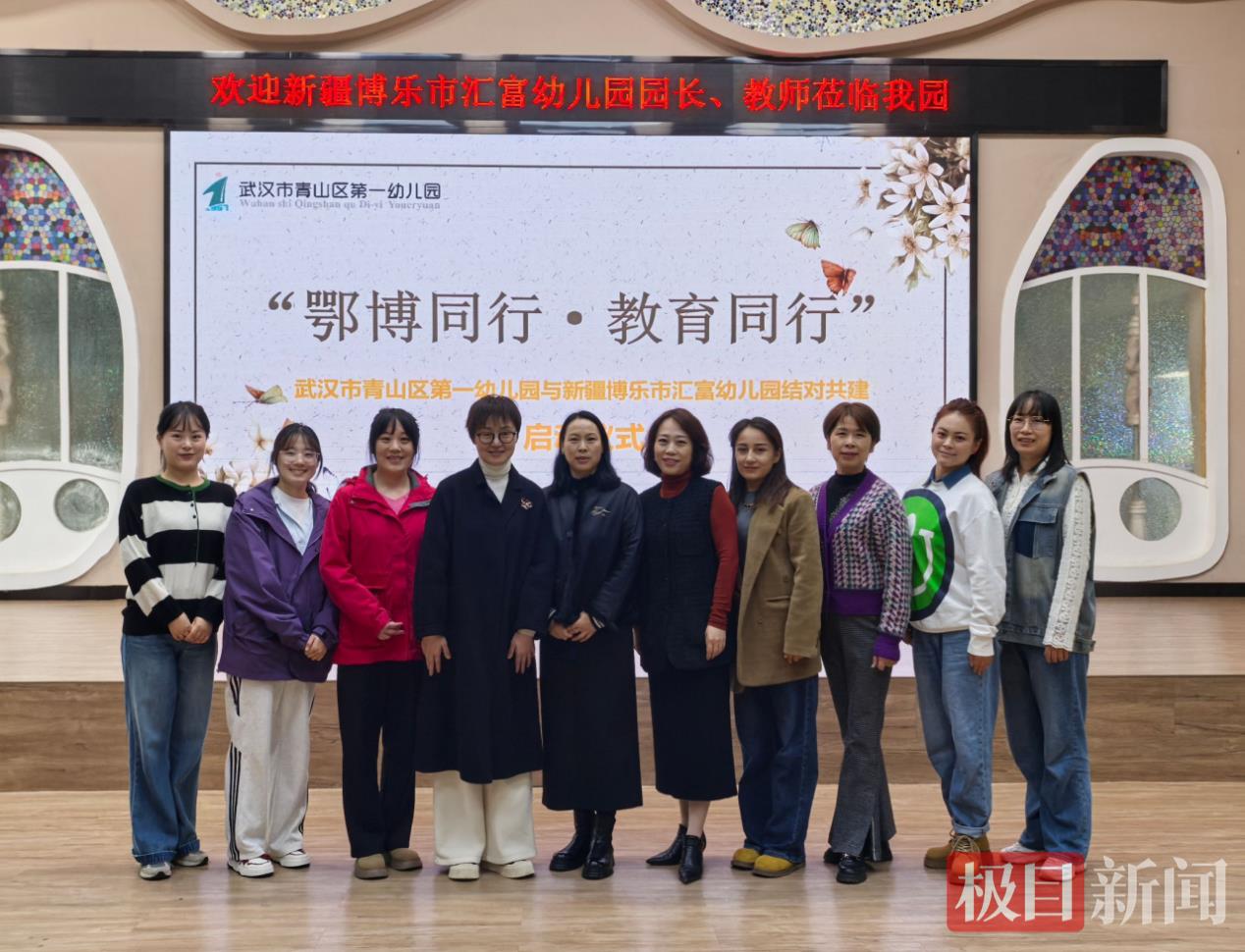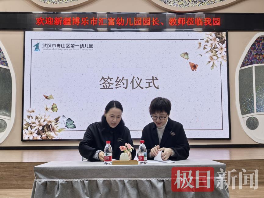 2025年11月10日至14日,武汉市青山区第一幼儿园迎来了新疆博乐市汇富幼儿园的园长及骨干教师团队,一场以“儿童立场”为核心的沉浸式交流活动温情启幕。从大班幼儿献花、合唱园歌的暖场环节,到赠书、签约的深度联结,这场跨越千里的幼教牵手,以实景观摩、跟岗学习、课程共研的方式,让“以儿童为中心”的教育理念从文字走向实践。
