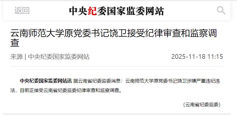 中央纪委国家监委网站讯据云南省纪委监委消息:云南师范大学原党委书记饶卫涉嫌严重违纪违法,目前正接受云南省纪委监委纪律审查和监察调查。